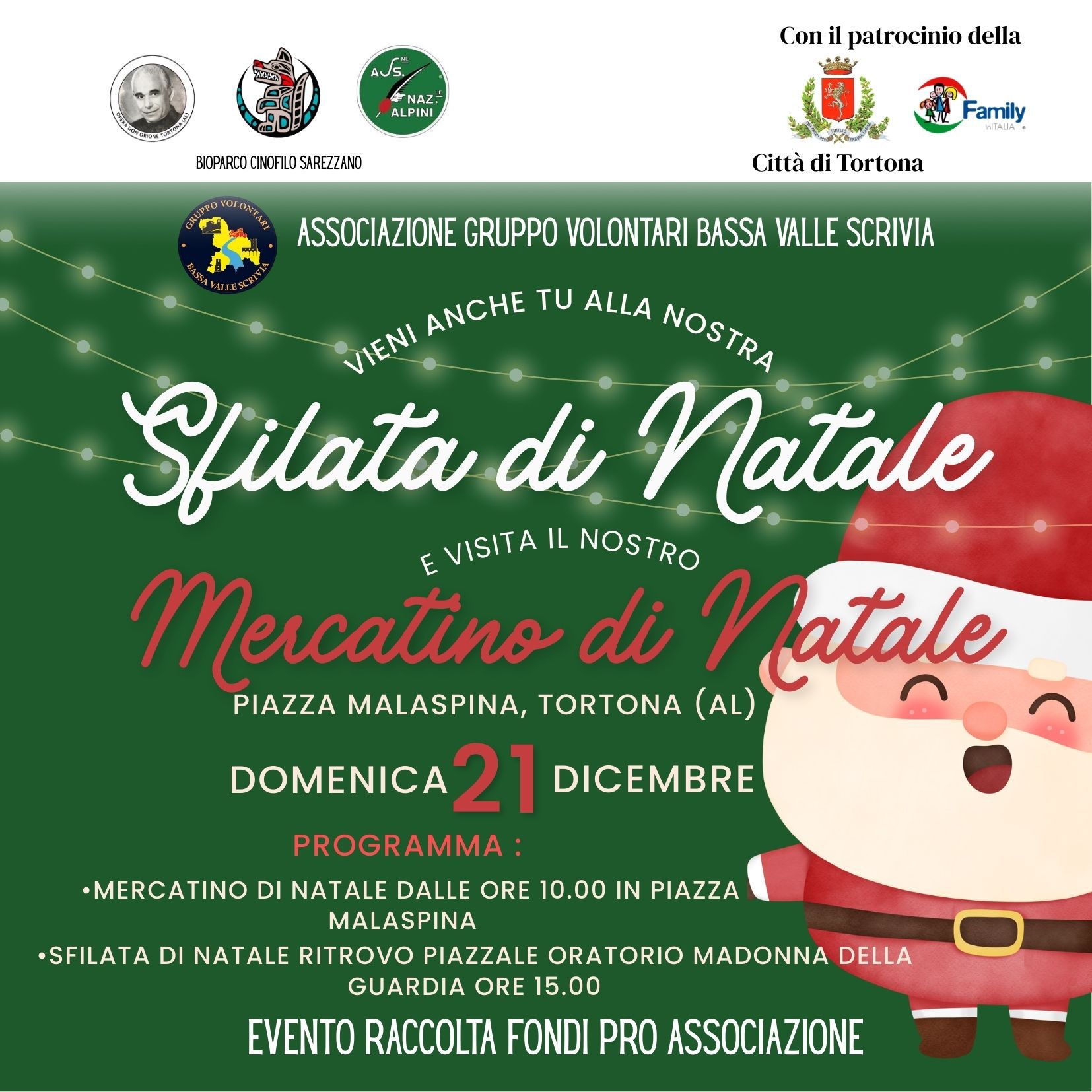 Domenica 21 dicembre dalle ore 10:00 in Piazza Malaspina verrà allestito un mercatino natalizio e si svolgerà la tradizionale sfilata dei Babbo Natale a cura dell’Associazione Protezione Civile Gruppo Volontari della Bassa Valle Scrivia.